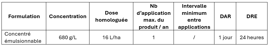 Pour l’acide pélargonique : formulation, dose homologuée, nombre d’application maximal, Intervalle minimum entre applications, Délai Avant Récolte (DAR) et Délai de Rentrée (DRE) 2
