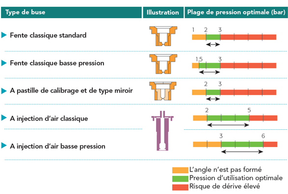 Tableau 1 : Cinq types de buses sont commercialisés. Les buses à injection d’air forment les plus grosses gouttes et sont réparties en deux catégories : les « classiques » et les « basses pression »
