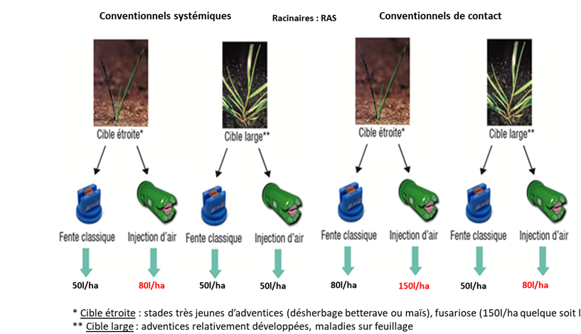 Figure 1 : Volume de bouillie minimum en fonction du mode d’action du produit, de la taille de la cible et du type de buse utilisé- synthèse d’essais réalisés depuis 2008.