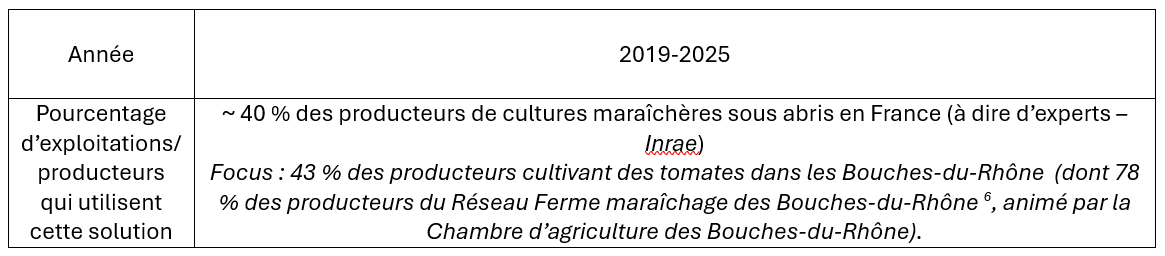 En 2022, l’IFT total (hors biocontrôle) de tomate est de 5,4 12. La technique a permis d’arriver à un IFT d’un peu plus de 1 en 2017 et 2018 (source réseau FERME 13).