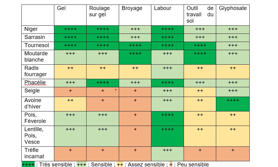 Tableau 1 – Modalité de destruction des cultures intermédiaires (Source : Arvalis, brochure « les vrais-faux des couverts »).