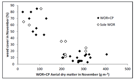 Il est important de souligner que les couverts seront rarement implantés en vue seulement de leur potentiel effet de compétition sur les adventices mais plus généralement pour un objectif de fertilité des sols ou de gestion des flux d’azote (cultures intermédiaires pièges à nitrate ou CIPAN) en combinaison avec la gestion des adventices. On parle alors de couverts multiservices. De plus, pour qu’il y ait compétition du couvert vis à vis des adventices ou repousses, il faut qu’il y ait compétition pour des éléments limitants (éléments nutritifs, eau, lumière), ce qui suppose que ces ressources soient effectivement limitantes. Lorsqu’il y a superposition temporelle entre la présence du couvert et le développement de la culture (cas 2 et 3), Il y a un équilibre subtil à trouver pour que le couvert altère le cycle des adventices sans affecter la culture.