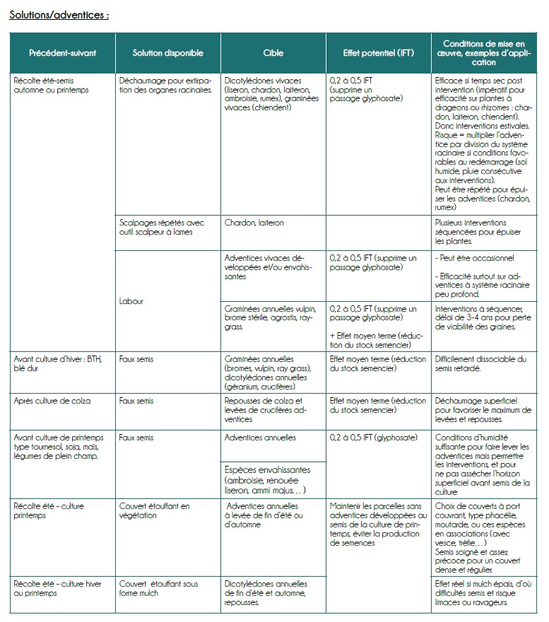 Pour le contrôle des adventices annuelles ou des repousses, la technique du faux semis et les travaux du sol sont les principales méthodes déployées.  La mise en place de couvert à action concurrentielle se développe également. Le choix de l’espèce adaptée repose sur une analyse pluricritères complexe qui peut rendre nécessaire l’utilisation d’un outil d’aide à la décision comme l’outil « Choix des couverts ».
