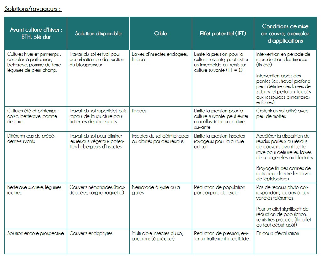 Vis-à-vis de ravageurs et des maladies, les leviers cherchent le plus souvent une action indirecte par la destruction de formes de conservation d’insectes, la perturbation de cycles de reproduction ou de vie, ou la disparation d’inoculum primaire dans le cas de maladies fongiques. L’effet sera le plus souvent partiel, dépendant du niveau de pression du bio-agresseur et de l’occurrence de conditions favorables à son développement en culture. Il peut améliorer la situation mais ne pourra pas toujours éviter un recours à une intervention chimique en culture.