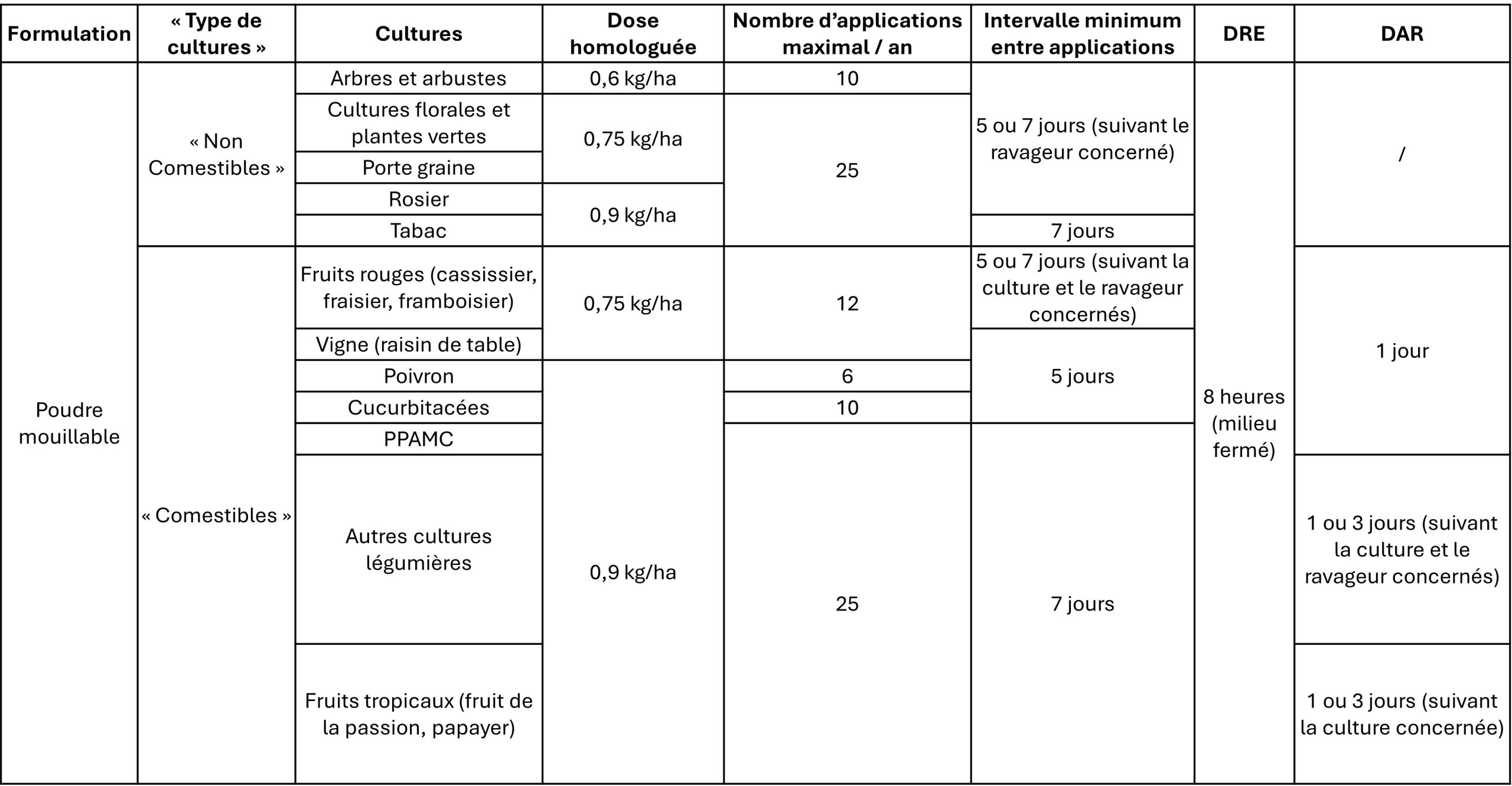 La compatibilité des produits contenant cette matière active avec les autres méthodes de protection et notamment les auxiliaires, facilite leur utilisation au sein des stratégies de protection biologique intégrée.