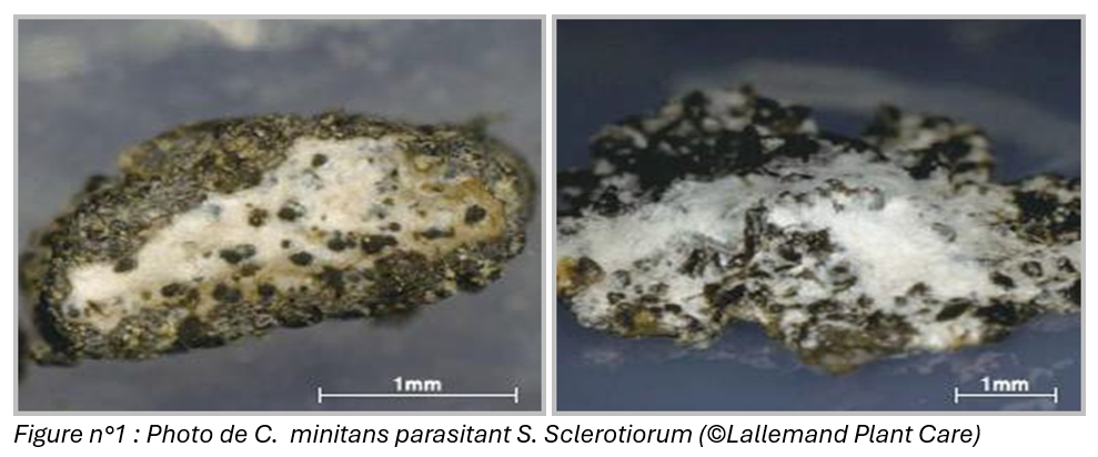 La germination des spores de C. minitans au contact d’un sclérote de S. sclerotiorum produit un tube germinatif qui conduit à la pénétration du mycoparasite dans le sclérote. Un mycélium se développe jusqu’à détruire le sclérote dans un délai de 2 à 3 mois suivant les conditions pédoclimatiques 2.