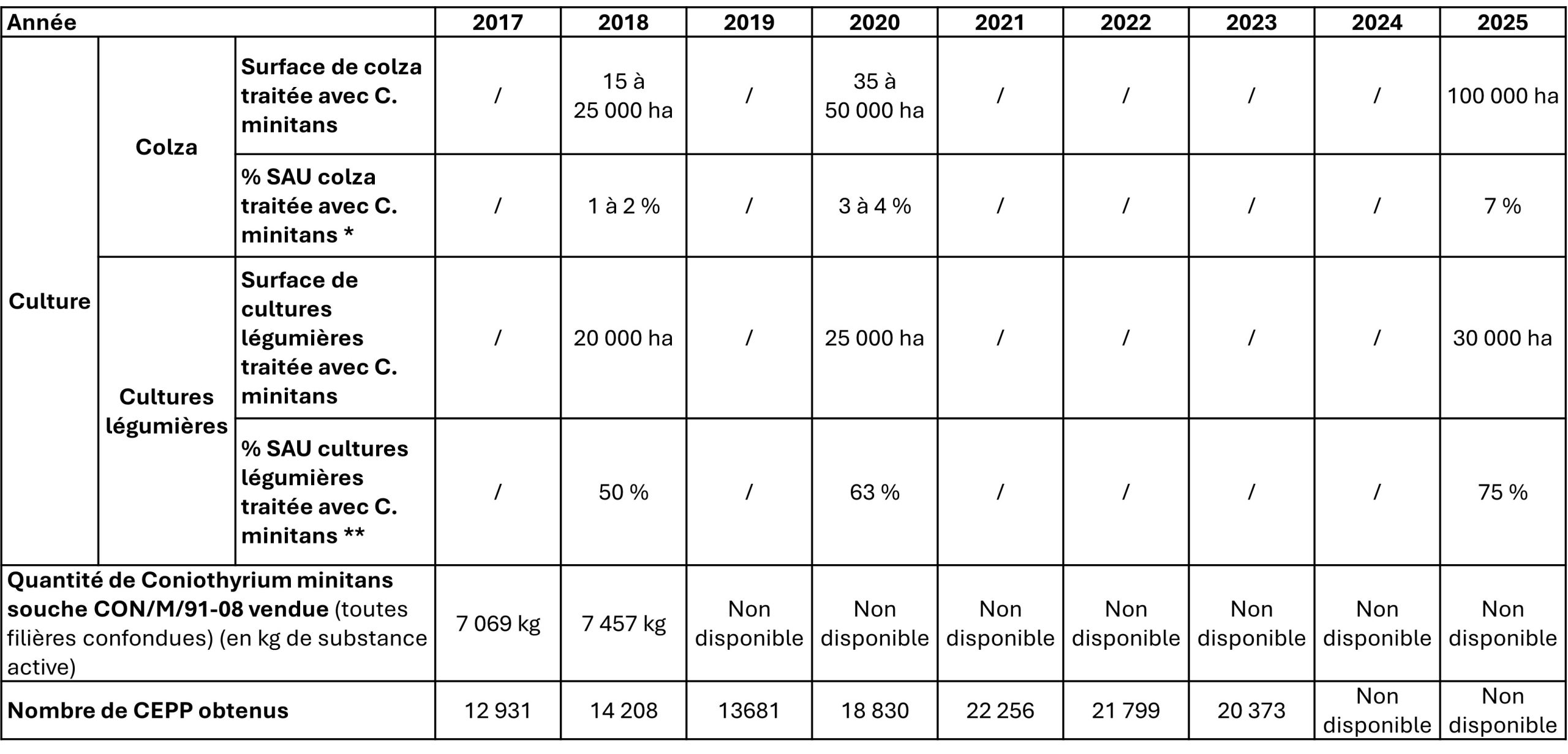 Il n’y a pas de limites d’utilisation de C. minitans concernant les conditions pédoclimatiques. Le mycoparasite peut se développer dans tous les types de sol et tous les contextes climatiques 3.