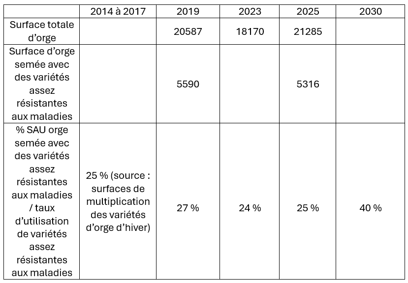 L’indicateur de déploiement est le taux d’utilisation de variétés assez résistantes aux maladies (variétés notées 7 ou plus dans le catalogue des variétés d’orge). Il peut être calculé grâce aux :