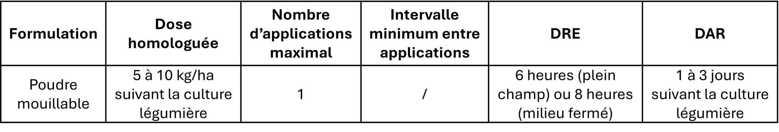 Formulation, dose homologuée, nombre d’application maximal, intervalle minimum entre applications, Délai Avant Récolte (DAR) et Délai de rentrée (DRE) 3 :