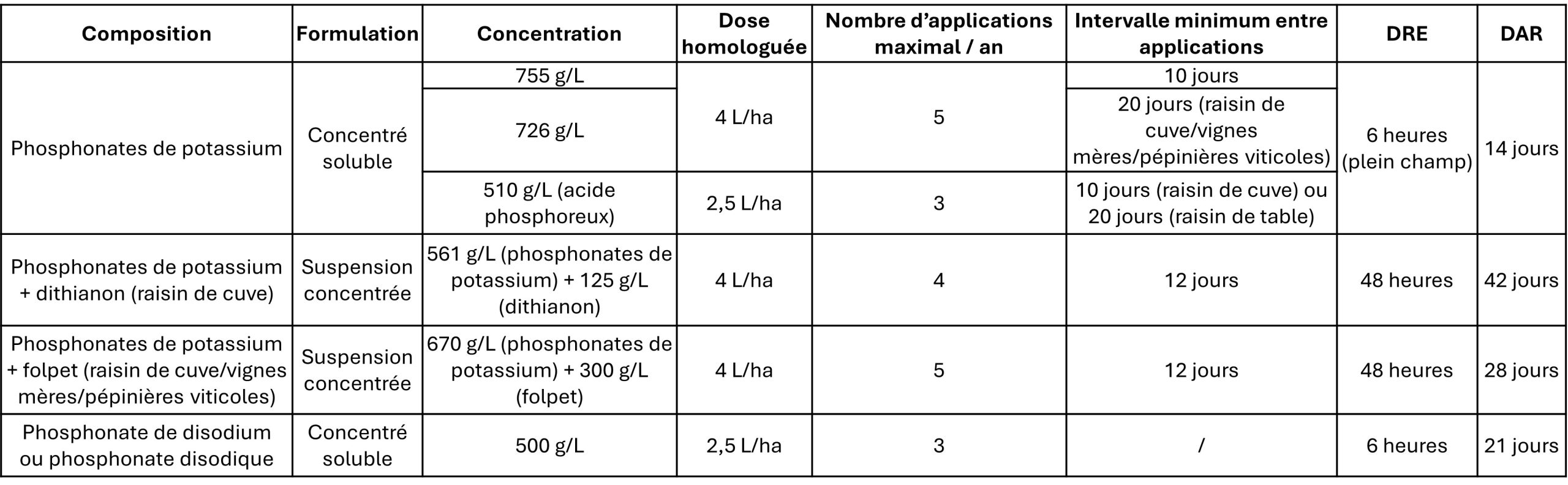 Il est conseiller de limiter les applications de préparations contenant des substances actives fongicides autorisées sur vigne à un total de 10 kg d'équivalent d'acide phosphoreux par hectare et par an 1.