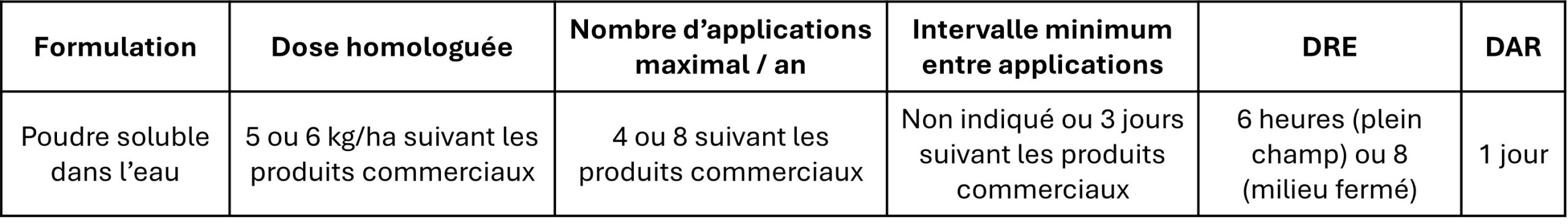 Formulation, dose homologuée, nombre maximal d’applications, intervalle minimum entre applications, Délai de Rentrée (DRE) et Délai Avant Récolte (DAR) : 1