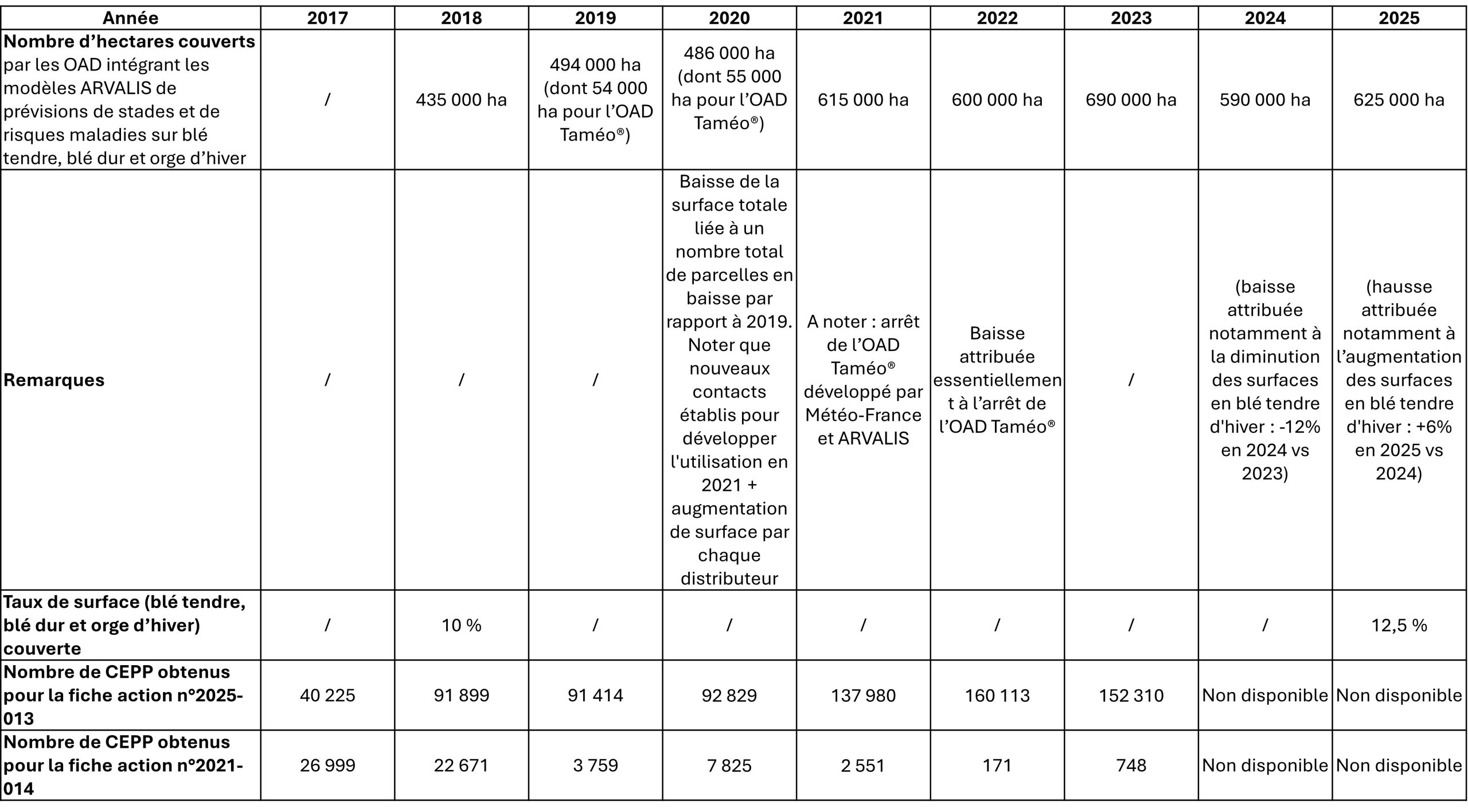 Différents OAD sont mis à disposition des agriculteurs pour optimiser les traitements contre les maladies du blé. Sans être exhaustif, il s’agit d’Opti-Protech (option de l’outil Mesparcelles diffusé par les Chambres d’agriculture, intégrant des prévisions issues de modèles ARVALIS), xarvio FIELD MANAGER (BASF, avec prévisions issues de modèles ARVALIS), application Météus (ISAGRI, application en lien avec les stations météo Météus et intégrant des prévisions issues de modèles ARVALIS), etc.