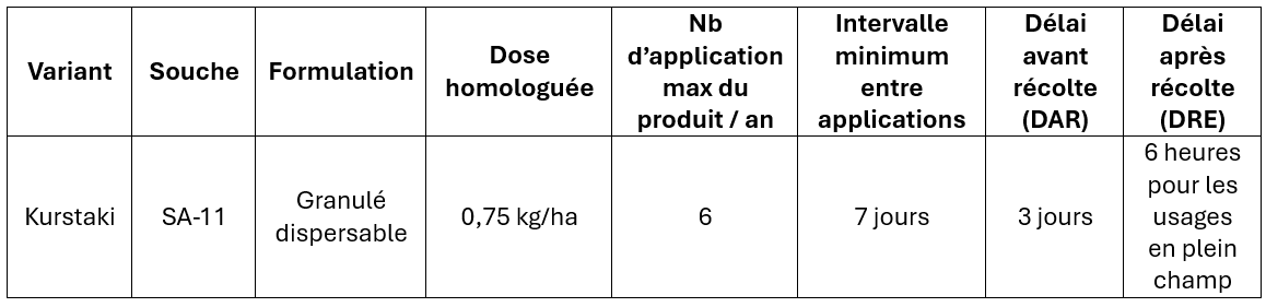 Pour la protection à base de Bacillus thuringiensis, l’application est foliaire. L’efficacité du traitement dépend de la quantité de produit ingérée par les chenilles et de la qualité de pulvérisation. A noter qu’il est conseillé de stocker B. thuringiensis dans un local à une température n’excédant pas 20°C3.