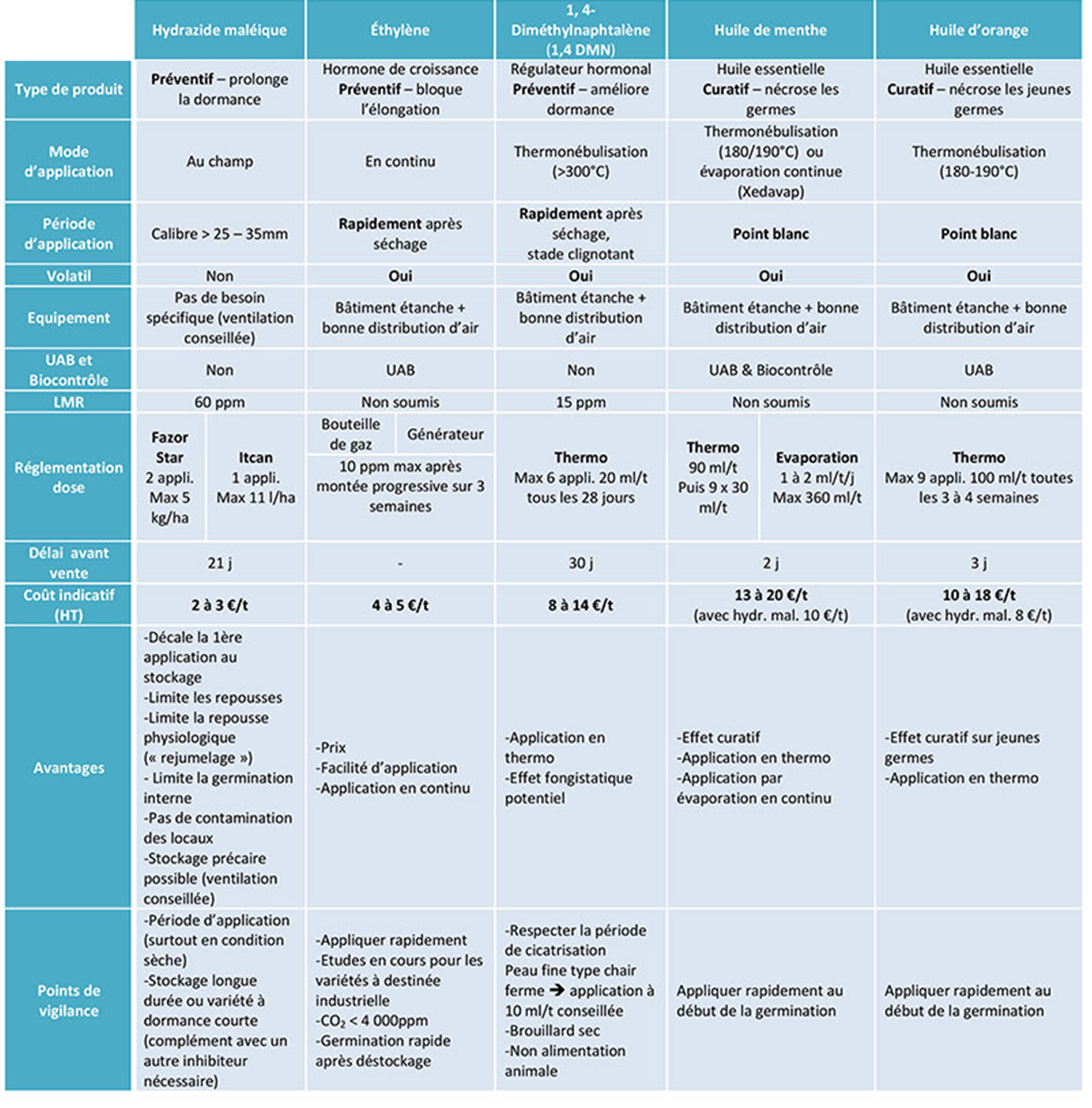 - l’optimisation des programmes antigerminatifs possibles, combinant modes d’action préventifs et curatifs, s’appuyant notamment sur le recours aux molécules existantes d’origine naturelles (huile de menthe, huile d’orange, éthylène, etc.) utilisables en système AB ou de type biocontrôle (voir tableau),