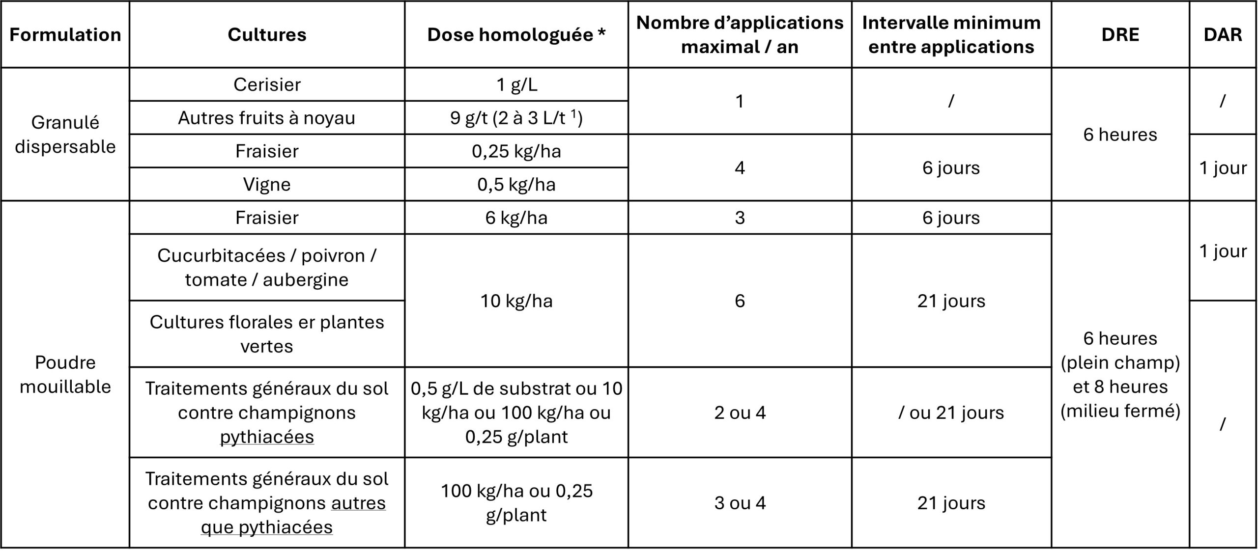 D’un point de vue réglementaire, le produit figure sur la liste des produits de biocontrôle 3. Cette solution est UAB et est éligible au CEPP (fiche action n°2017-026 « Lutter contre les champignons telluriques au moyen d’un produit de biocontrôle » 4).