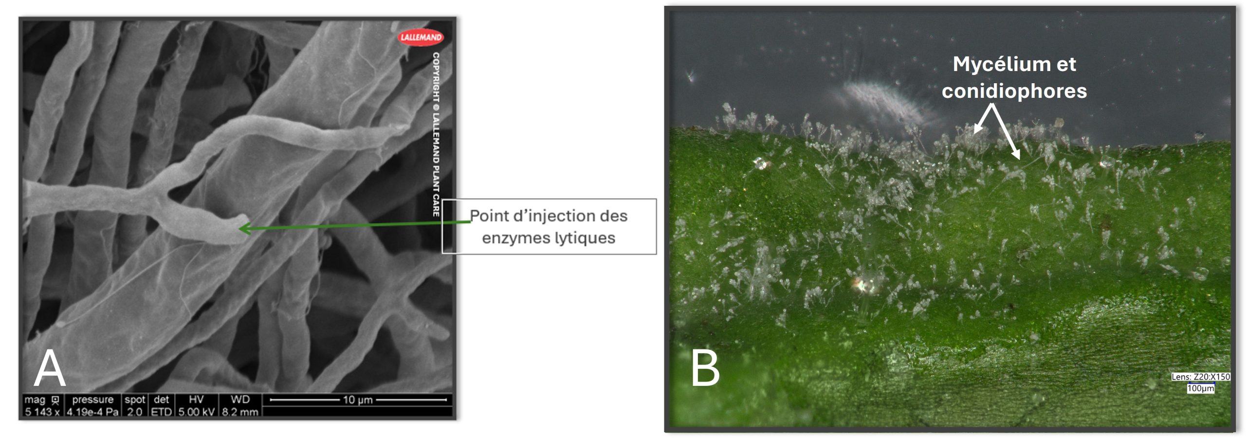 Figure n°1 : A - Appressorium de G46 sur Fusarium. Les hyphes à croissance rapide adhérent et produisent des enzymes lytiques pour pénétrer l’hôte puis excrètent des enzymes pour dissoudre les parois et se nourrir du contenu cellulaire / B - Développement de mycélium et production de conidiophores à la surface des feuilles de tomates : couverture fongique, occupation de l’espace et protection contre les pathogènes. Vue au microscope Keyence. (©Lallemand Plant Care).