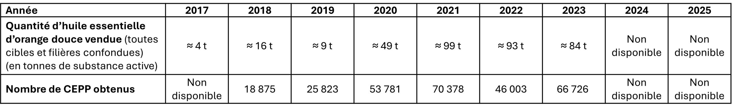 - Plantes Ornementales (Arbres et arbustes, Cultures florales et plantes vertes, rosier) : L’utilisation de l’huile essentielle d’orange permet d’économiser entre 0,5 et 2 IFT par an sur un parcours de protection standard anti-oïdium, anti-mildiou et/ou contre les maladies des taches noires (selon les cultures et usages homologués) soit en remplacement de solutions conventionnelles, soit dans des stratégies en association avec une réduction de dose.
