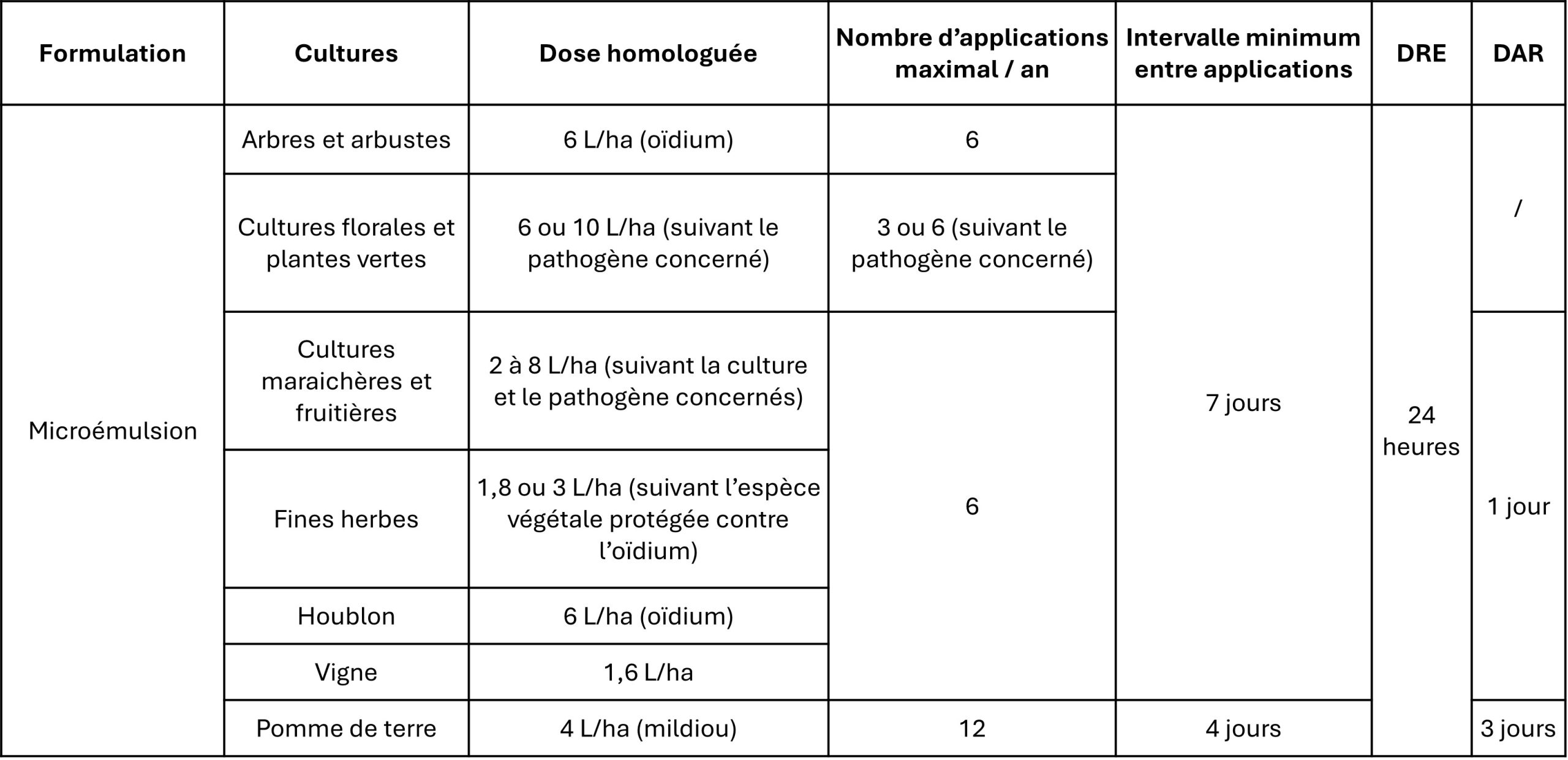 Santé : S’agissant d’un produit de contact, son action se fait dans les heures qui suivent le traitement et il n’y a donc pas de résidus. Cette substance active est exempte de Limite Maximale de Résidu (LMR) ce qui la rend intéressante dans une démarche de qualité comme les démarches « zéro résidu de pesticides ».