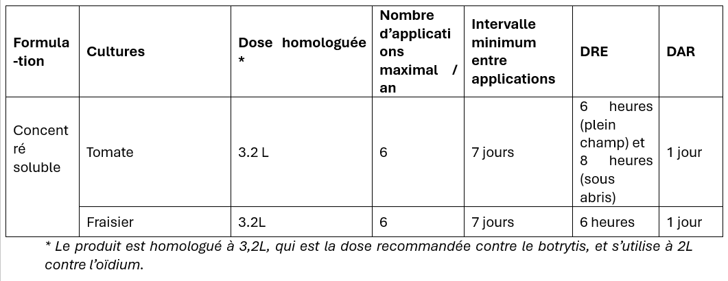 La solution permet le contrôle de l'oïdium et du botrytis en cultures légumières (tomate et fraise) et en vigne ainsi que des monilioses en cultures fruitières (fruits à noyaux) et de la pyriculariose du riz.